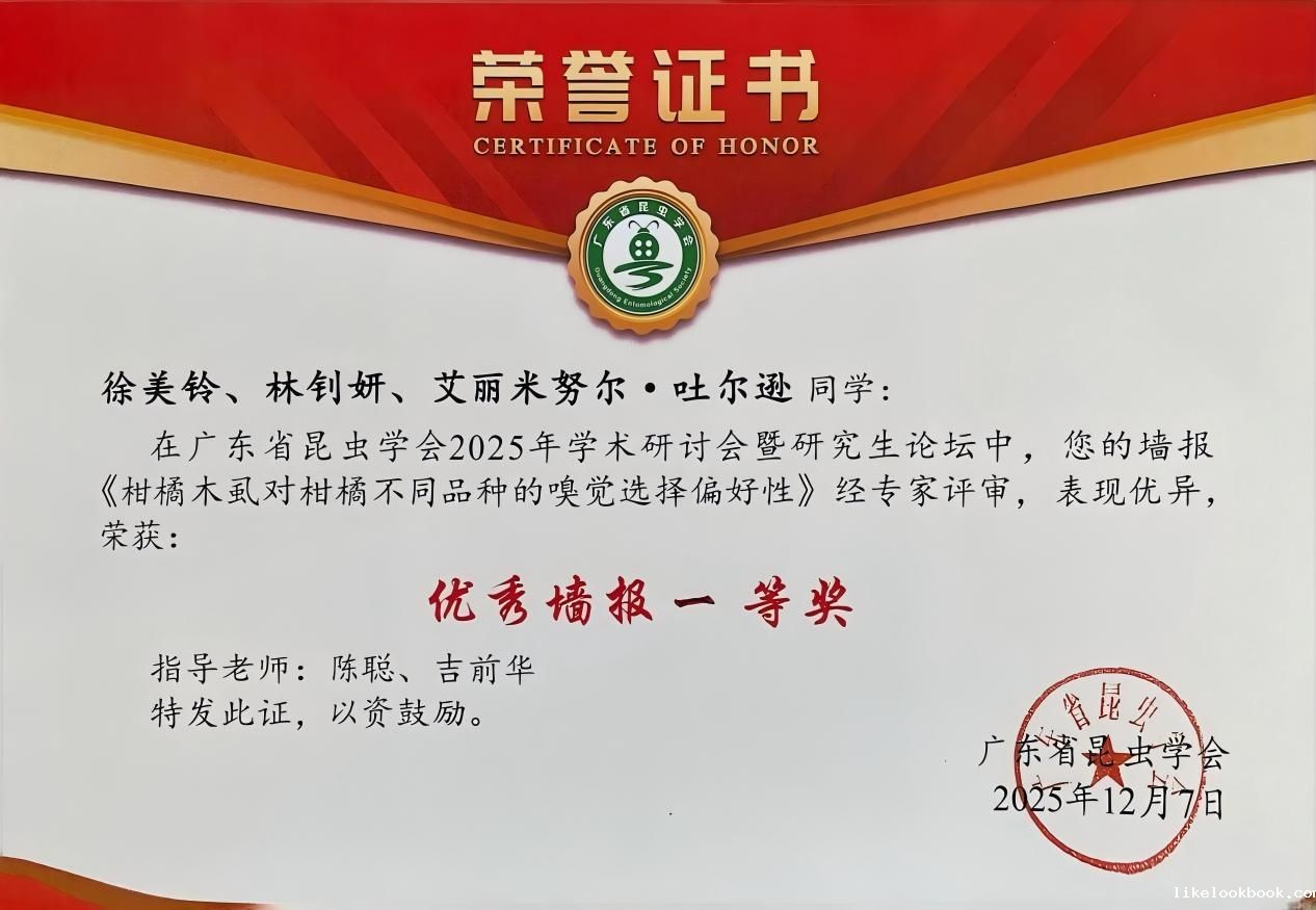 我校生命科学学院生物科学专业本科生徐美铃、林钊妍、艾丽米努尔·吐尔逊共同承担的2024年国家级大学生创新训练计划项目(编号:202410580009)完成的学术墙报作品《柑橘木虱对柑橘不同品种的嗅觉选择偏好性》,生物科学专业本科生叶志灏、曾裕派和生物技术专业本科生李晓山共同承担的2025年国家级大学生创新训练计划项目(编号:202510580009)完成的学术墙报作品《基于驱避活性与效能验证的柑橘木虱驱避剂研发研究》,凭借扎实的研究内容与专业的展示设计,在省昆虫学会2025年学术研讨会中荣获优秀墙报一等奖,展现出较强的科研实践能力。
